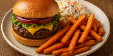 🍔 Beef Burgers with Sweet Potato Fries & Coleslaw (Serves 5)